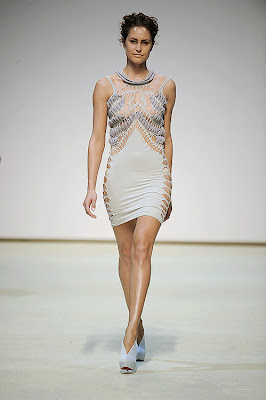 Mark Fast not only placed curvaceous models on the catwalk this Spring, he boldly clothed them in spandex dresses some might find reminiscent of a stroll down Santa Monica Blvd., EAST of Highland. Although I couldn't quite embrace (wear) the entire collection, there were pieces that left me writhing with desire. His layered ruffles were delectable, and his intricately torn patterns were mosaic in design. This collection is definitely for the bold and the beautiful.